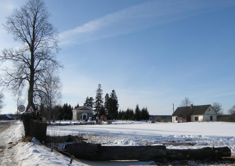 Вёска Казлоўшчына (Пастаўскі р-н). На дальнім тле – капліца-пахавальня князёў Друцкіх-Любецкіх. І ўдзячнасць нашчадкаў – спілавая 200-гадовая ліпа, пасаджаная князямі, на тле іх месца вечнага спачыну.
