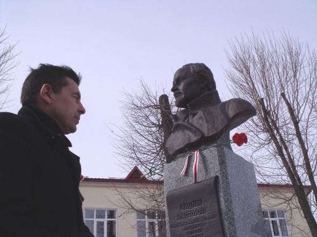 Палітык Яраслаў Берніковіч паклаў кветкі да помніка Вацлаву Ластоўскаму ў Глыбокім. Фота Кастуся Шыталя.