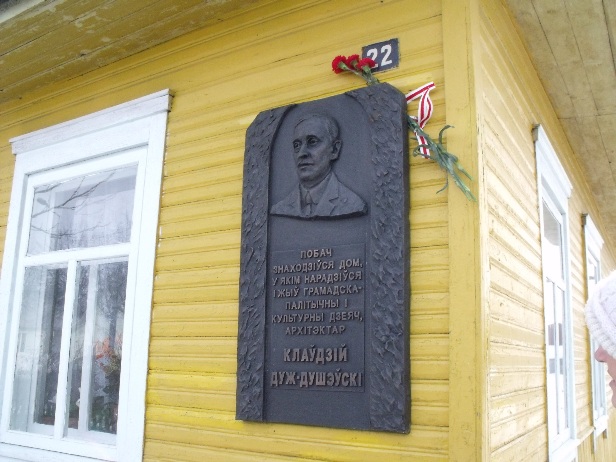 Мемарыяльная дошка ў гонар Клаўдзія Дуж-Душэўскага, пастаўленая побач з месцам ягонага нараджэння. Фота Кастуся Шыталя.