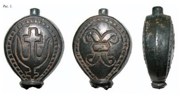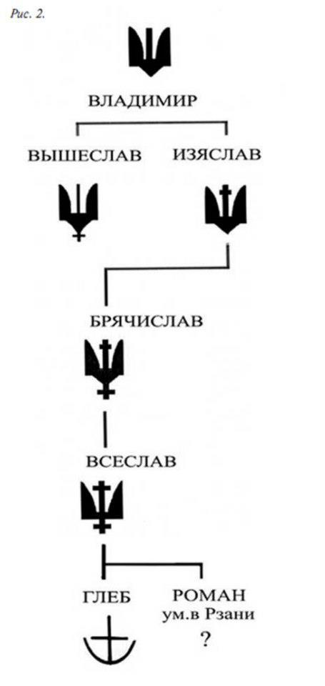 Зробім кароткі пераказ артыкула у выглядзе цытат. "...Гирька литая... ушко для подвешивания отломано (рис.1)... На стороне 1 изображён знак в виде геральдического трезубца с острыми отрогами по бокам, загнутыми к верху, и двумя крестами в середине трезубца и внизу под его основанием. Находки знаков Рюриковичей встречаются на кистенях данного типа... На стороне 2 знак в виде буквы Х, перехваченной в средней части пояском... Белецкий С.В. справедливо считает этот знак (на стороне 1) принадлежностью именно Всеслава Брячиславовича – единственного сына Брячислава Изяславовича (рис.2)... Находка этого кистеня... будучи найденной в 5 км от Старой Рязани, невольно вспоминаются страницы Никоновской летописи, повествующей, что в 1114 году в Рязани представились князья "Роман Всеславович и Мстислав, внук Игорев".