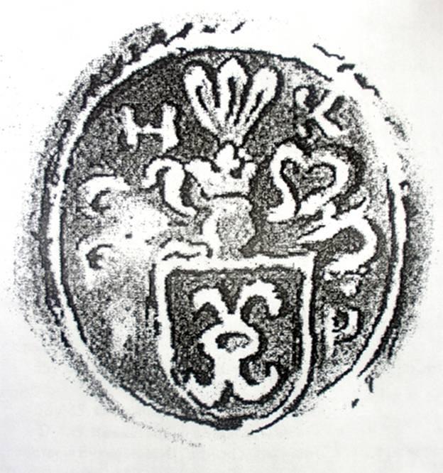 Пячатка Гераніма Корсака 1649 г. На малюнку герба кальцо, ад якога адыходзяць палавінкі, але гэта надзея зрастаючых палавінак.