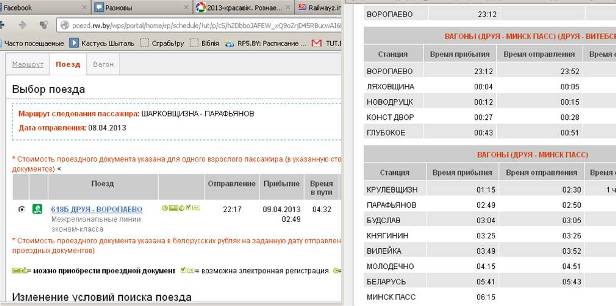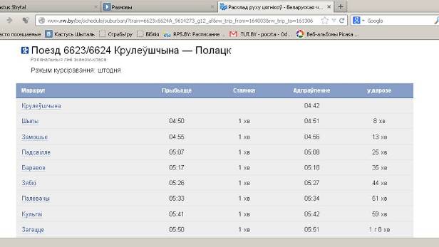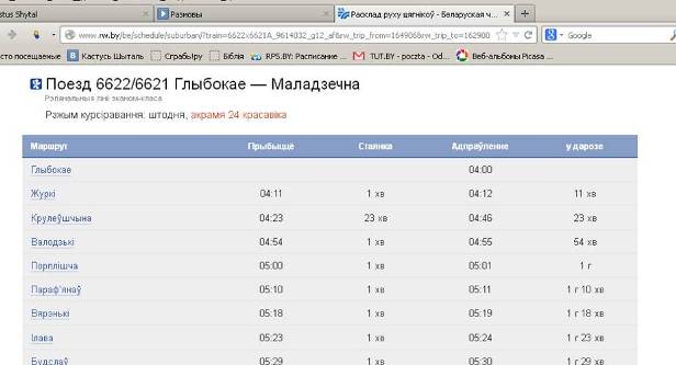Дарэчы, на сайце чыгункі можна знайсці расклад усіх цягнікоў, што ходзяць па Беларусі. Добра, што пры пошуку маршрута загадзя паведамляецца пра адмены прыгарадных цягнікоў. Праезд у пасажырскіх цягніках можна аплаціць праз Інтэрнэт пры дапамозе банкаўскай карткі - касу тады ісці не трэба, досыць паказаць правадніку пашпарт. Адрас - rw.by/be