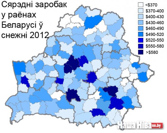 Хотите узнать больше? Карта сярэдняга заробку за снежань 2012 года ў Беларусі. Інфаграфіка "Нашай Нівы". (Націсніце, каб павялічыць). Нацыянальны статыстычны камітэт