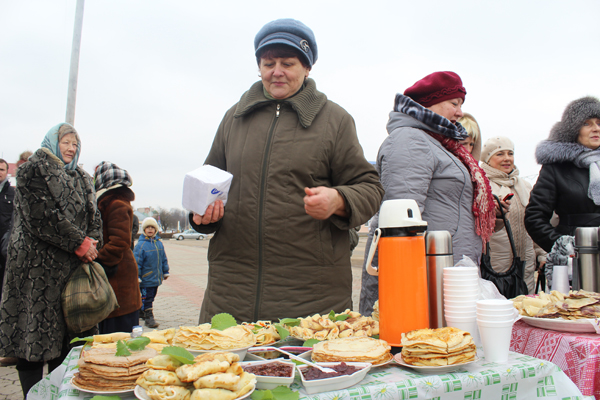 Таму першае, што прыцягнула маю ўвагу, калі толькі прыйшла на Масленку – гэта мноства сталоў па баках плошчы. Яны літаральна ламіліся.