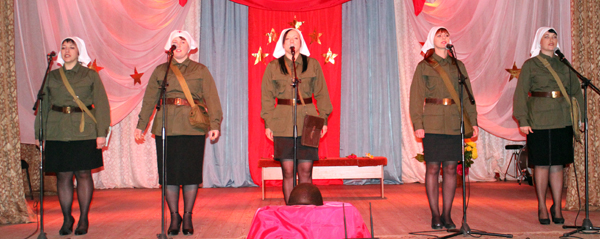 Следующими военно-патриотическую песню «Ветераны минувшей войны» представили МЧСовцы. Исполнили настолько проникновенно, что заслужили крики «Браво!» и громкие аплодисменты зрителей. Не только душевное пение, но и небольшое театрализованное представление подарили собравшимся в зале работники Центра детей и молодёжи (на снимке). Выбор музыкального произведения был неслучаен.команда "Солнце"