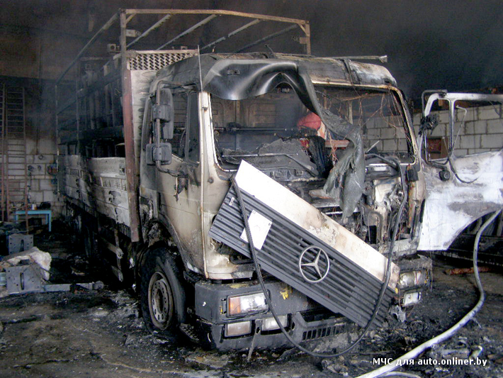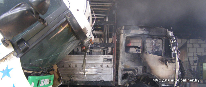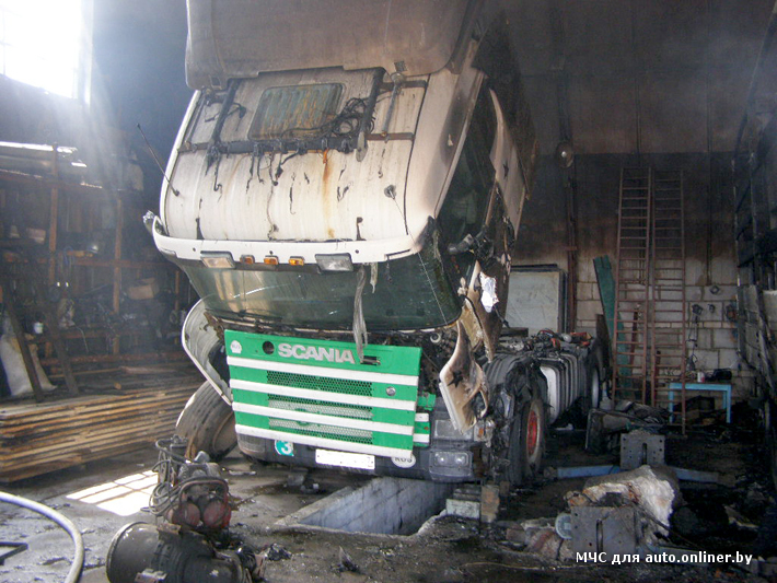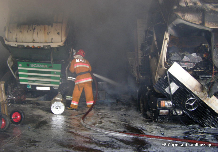 Возгорание произошло вчера около 11:00 часов утра в ангаре каркасного типа, обложенном кирпичом. Как установили сотрудники МЧС, сначала загорелся Mercedes (у него поврежден моторный отсек, кабина и колеса). Затем пламя перебросилось на стоявшую рядом Scania (у которой повреждена кабина). Оба автомобиля — с российскими номерами.