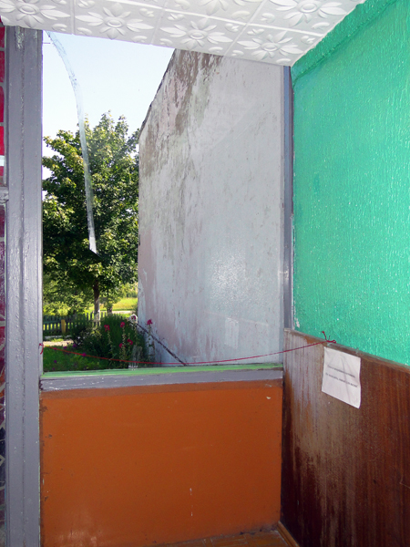 Попробовав ногами доски пола и убедившись, что они действительно вибрируют, мы отправляемся смотреть окно, в котором нужно заменить стекло (на снимке). Трещина в нём была давно. Татьяна Игнатьевна заклеивала её скотчем. В июне из-за сильного ветра кусок стекла всё-таки выпал. Теперь проблема с оставшимся. Доставать его, по мнению Т. И. Шалупкиной, лучше специалистам, потому что деревянный каркас прогнил и может поехать верхнее стекло. В отдел культуры по этому вопросу обращалась. Но там пока не торопятся разрешить ситуацию. Хотя и руководителю Дома фольклора, и приходящим сюда людям хотелось бы, чтобы необходимые работы были выполнены и табличка «Окно в аварийном состоянии. Не подходить, опасно для жизни!» снята.