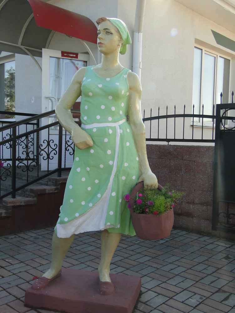 Безусловно, своеобразной «изюминкой» благоустройства этого предприятия является женская статуя. Когда-то женщина держала лопату и была символом самоотверженного нелёгкого труда. Теперь орудие производства убрали и дали ей в руку корзину, что, конечно же, больше соответствует прекрасному полу. А ещё «подарили» новую одежду. Раньше изваяние было просто серого цвета. Теперь щеголяет в салатовом сарафане в горошек. А на Новый год преображается в настоящую Снегурочку. Причём, наряд у внучки Деда Мороза не с чужого плеча, а собственный. В ЛУК ПБО «Дабрабыт» пошили юбочку, пелерину, шапочку. На голову надевается корона, а на шею бусы. Осталось добавить, что глаза застывшей красавицы аккуратно подведены, а губы Татьяна Анатольевна не забывает подкрасить яркой помадой. Однажды данную статую было предложено перенести в парк микрорайона «Школьный», но руководитель предприятия Л. И. Снаров сказал решительное «нет». На территории организации изваяние стоит уже не один десяток лет, стало её неотъемлемой частью. Даже, в каком-то роде визитной карточкой.