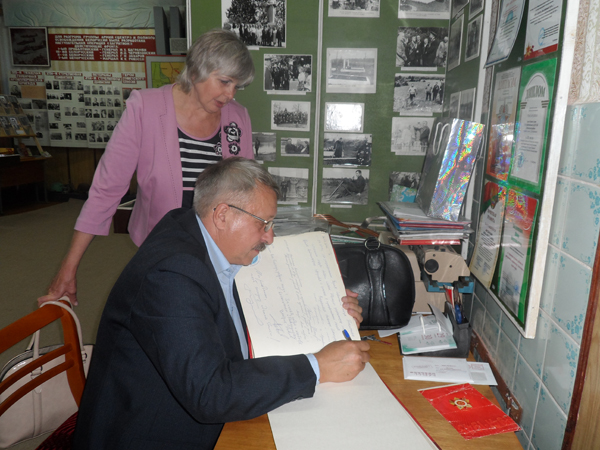 За совместным чаепитием, просмотром газетных публикаций и фотографий время пролетело совсем незаметно. Надо поторопиться: прибывших из Тулы ждёт экскурсия по школьному музею, где основной из четырёх разделов посвящён периоду Великой Отечественной войны. Кстати, в этом году ему, старейшему в районе учреждению такого типа, решением коллегии Министерства культуры Республики Беларусь присвоен статус Народного. Официальную бумагу, подтверждающую этот факт, директору музея Дине Анатольевне Богданович со словами поздравлений вручил во время торжественного вечера, состоявшегося в середине февраля с.г., председатель Лиозненского райисполкома Иван Антонович Лавринович.