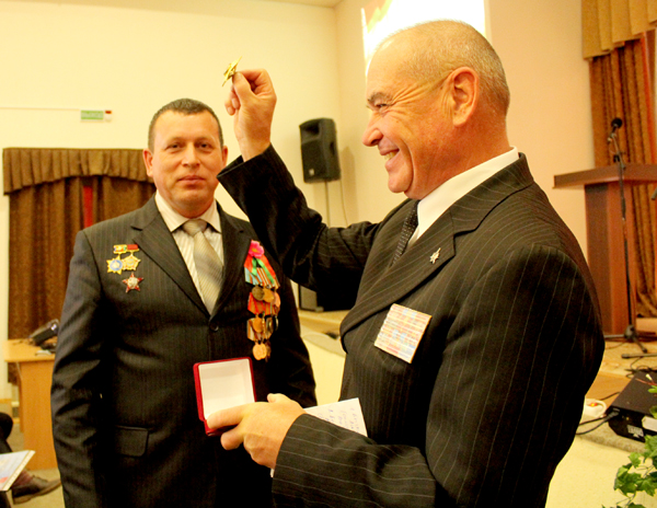 Г. М.Егоров вручает знак "Почетный ветеран" П. В. Глобе
