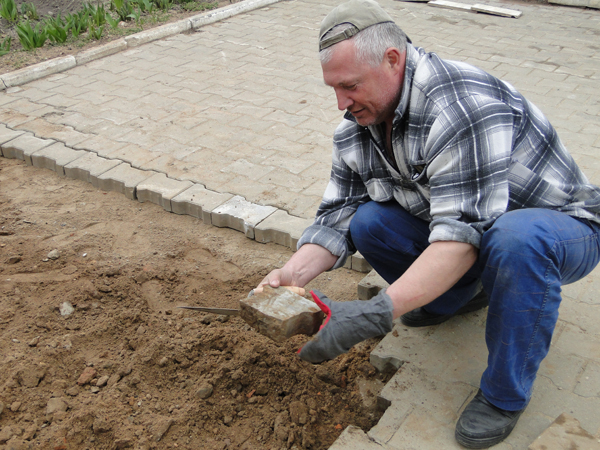 Пока женская часть коллектива Лиозненской детской школы искусств орудовала на Шоссейной граблями и метлами, мужчины трудились у здания своей школы: выкорчёвывали пни и укладывали плитку на дорожке, ведущей к центральному входу.