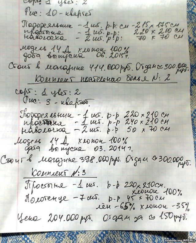 Людям достаются комплекты постельного белья и полотенец. Люди составляют свои "прайс-листы", чтобы продать продукцию, полученную вместо денег. Причём готовы продавать со скидкой по сравнению с реальной ценой товара в магазине.