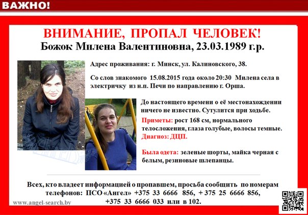 Добровольный поисковый отряд объявил розыск минчанки Божок Милены Валентиновны 1989 года рождения. Милена проживает в Минске, последний раз ее видели в Печах 15 августа. На железнодорожной остановке Печи около 20-30 она села на электричку до Орши и после этого ее местонахождение не известно. Не исключено, что сейчас она находится где-то в нашем городе. Утром 19-го числа на некоторое время ее мобильный телефон был включен, но на звонки она не отвечала. Днем 19-го телефон снова оказался выключен.