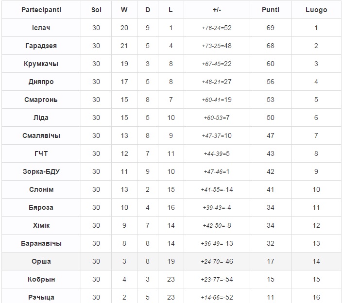 Ниже "Орши" в чемпионате финишировали лишь "Кобрин" и "Речица". "Речица" вылетает во 2-ю лигу, оттуда поднимаются "Луч" и "Торпедо" из Минска, а также "Узда". В высшую лигу с 1-й выходят "Ислочь" (Минский район), "Городея" и "Крумкачы" (Минск). Из высшей лиги вылетает "Гомель".