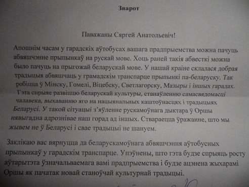 Хотите узнать больше? Аршанцы пішуць звароты з просьбай вярнуць родную мову ў транспарт.