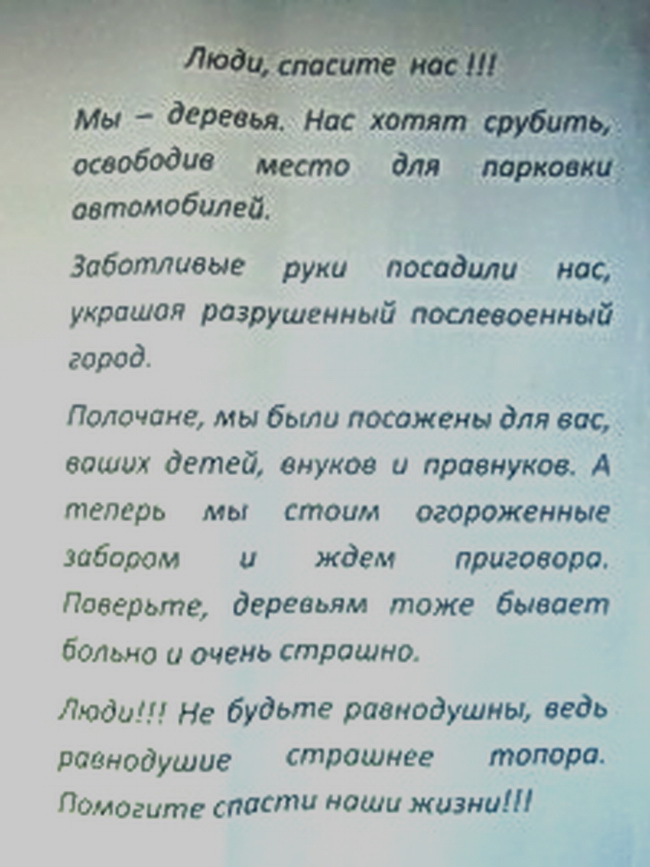 К защите деревьев в привокзальном сквере Полоцка подключились дети. Листовки с призывом «Люди спасите нас!!!» появились на деревьях, предполагаемых к вырубке.