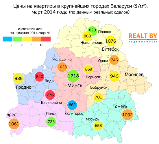 Как отмечают аналитики, спрос на квартиры в I квартале текущего года по сравнению с аналогичным периодом 2013 года был ниже в большинстве городов Беларуси. Снижение продаж до 20% было отмечено в Полоцке, Новополоцке и Бобруйске, на 20-30% меньше квартир было продано в Солигорске, Борисове, Молодечно и Орше.