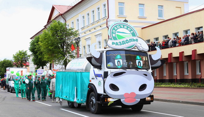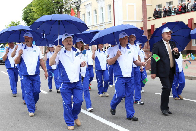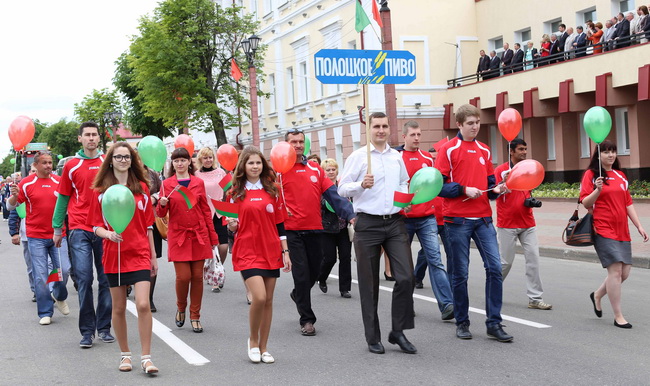 Празднично украшенные колонны представителей трудовых коллективов, предприятий и учреждений Полоцка, прошли под балконом, с которого на них смотрело руководство Полотчины во главе с председателем райисполкома Николаем Шевчуком, председателем райсовета депутатов Иосифом Грибовичем и почётными гостями праздника.