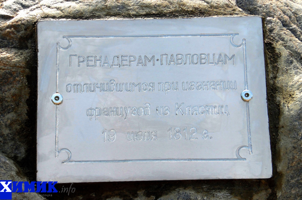 «В 1912 году в честь столетия битвы при Клястицах в этом населенном пункте был установлен мраморный памятник воинам 2-го Павловского гренадерского полка, которые по пылающему мосту через реку Нища бросились на другой берег в штыковую атаку и первыми вошли в Клястицы, освобождая деревню от отступающих французских войск, – рассказал “Химику” Андрей Буховецкий. – Как утверждают старожилы, памятник гренадерам был из белого мрамора, высотой около трех метров. Стоял он на фундаменте из больших природных камней, залитых известковым раствором. В 1941 году памятник был разрушен. Мы опросили местных жителей и, благодаря помощи Николая Печкурова, установили точное место, где стоял памятник. Там даже сохранились небольшие валуны от фундамента».