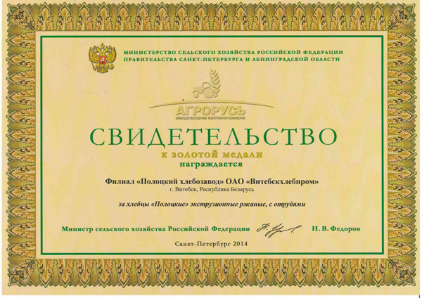 Высокое качество продукции Полоцкого хлебозавода было отмечено на XХIII Международной агропромышленной выставке-ярмарке «Агрорусь-2014», которая проходила в конце августа в Санкт-Петербурге.