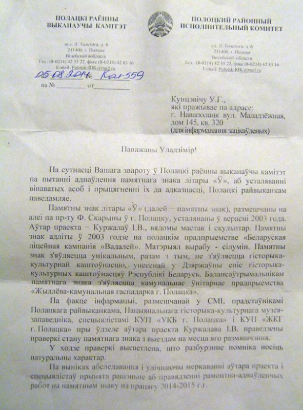 «По факту информации, размещенной в СМИ и интернет-ресурсах, о частичном разрушении надписи на памятном знаке белорусской букве “Ў” (сбиты буквы на надписи “От Полоцка начался мир…”) полоцкий райисполком провел проверку, – сообшается в ответе местных властей на обращение активистов о том, что в Полоцке поврежден памятный знак.