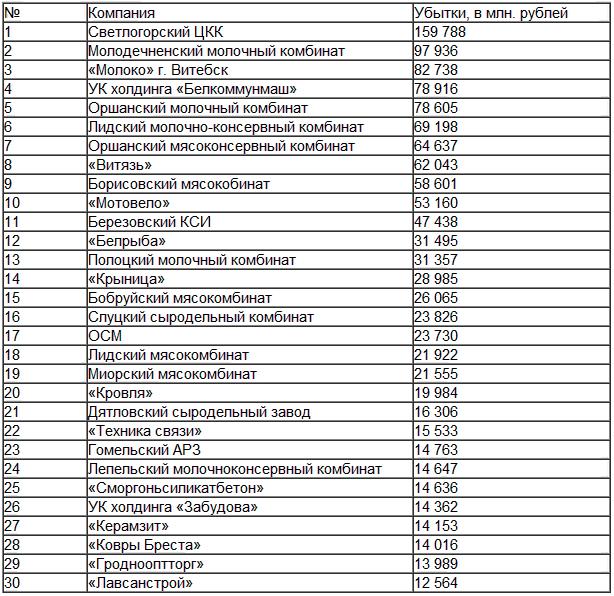 Топ-30 убыточных белорусских ОАО