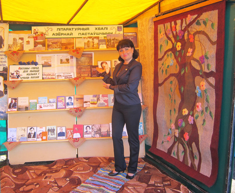 — У нашу задачу ўваходзіла афармленне творчай пляцоўкі. Мы назвалі яе «Літаратурная хваля азёрнай Пастаўшчыны». Асноўны ўпор зрабілі на выставе кніг мясцовых літаратараў. Аформіла яе загадчыца аддзела абслугоўвання цэнтральнай раённай бібліятэкі Іна Бандарэнка. Усім, хто цікавіўся творамі нашых землякоў, яна падрабязна расказвала пра біяграфію і творчасць пастаўскіх аўтараў. Жадаючых даведацца пра іх як мага больш было шмат, — адзначае Аксана Сакалова. — Цэнтральнае месца ў кніжнай экспазіцыі адвялі нашаму вядомаму земляку Уладзіміру Дубоўку. Усяго ж было прадстаўлена каля 10 аўтараў. Непаўторную адметнасць творчай пляцоўцы надаў банар, на якім былі намаляваны партрэты мясцовых паэтаў і празаікаў, а побач — кароткія цытаты з іх твораў. Дзякуй Пастаўскаму каледжу, які гэты банар нам даў. А ўвогуле, мы бязмежна ўдзячны ўсім, хто дапамог у арганізацыі паездкі ў Быхаў.