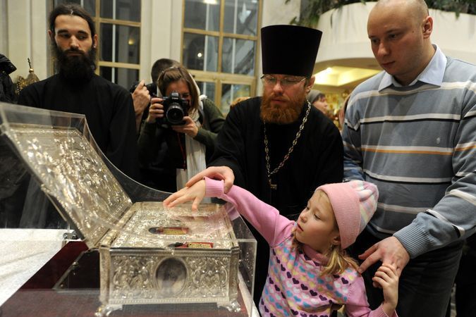 Ранним утром 21 января православные жители Постав по благословению настоятеля храма отца Валерия отправились поклониться этим великим святыням. В пути нас сопровождал батюшка Павел. Минск встретил морозной солнечной погодой. Мы влились в нескончаемый людской поток, текущий ко входу в храм Дома милосердия. Вдоль вереницы людей стояли автобусы, в которых можно было согреться, палатки Красного Креста, где предлагали горячий чай. Никто не роптал. Люди шепотом читали молитвы, а на лицах была радость.
