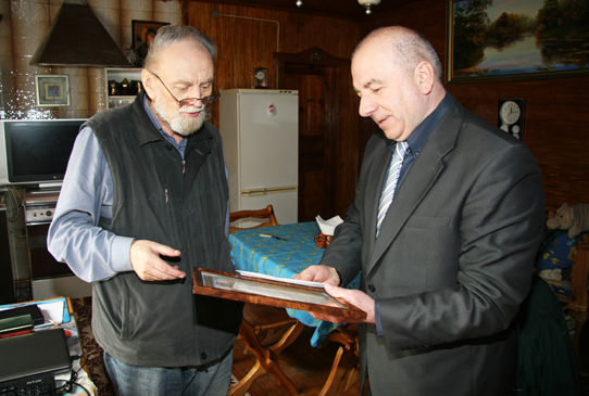 На здымку: В. С. Гутараў уручае ўзнагароды лаўрэату абласной літаратурнай прэміі А. А. Валодзьку.