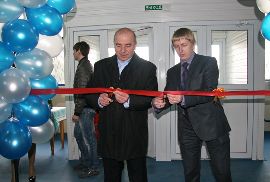 Старшыня раённага выканаўчага камітэта Віктар Сяргеевіч Гутараў і дырэктар ПУВП “Завод “Беліт” Дзмітрый Барысавіч Чыжэўскі пераразаюць сімвалічную стужку на адкрыцці новай залы рынка “Гарызонт”.