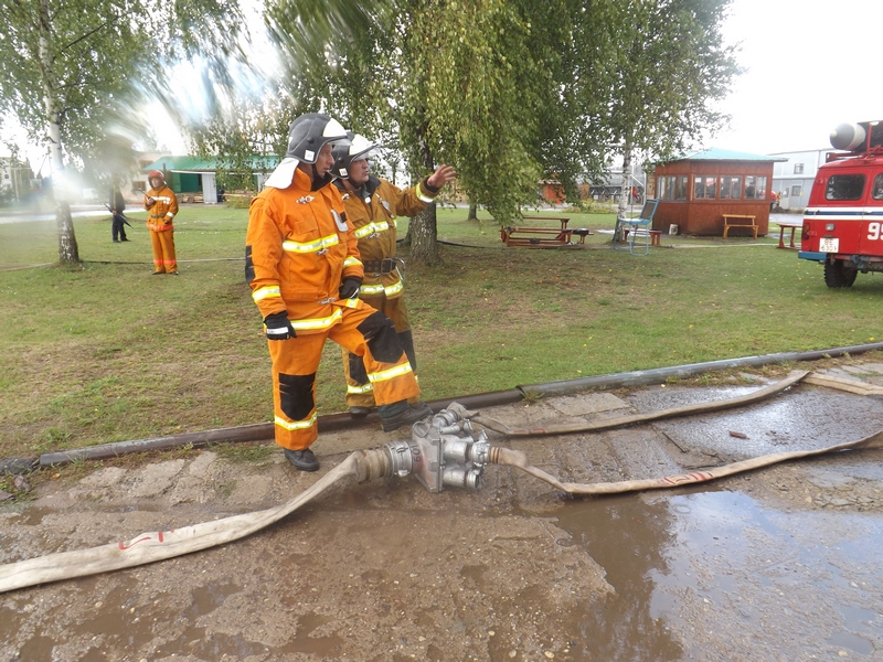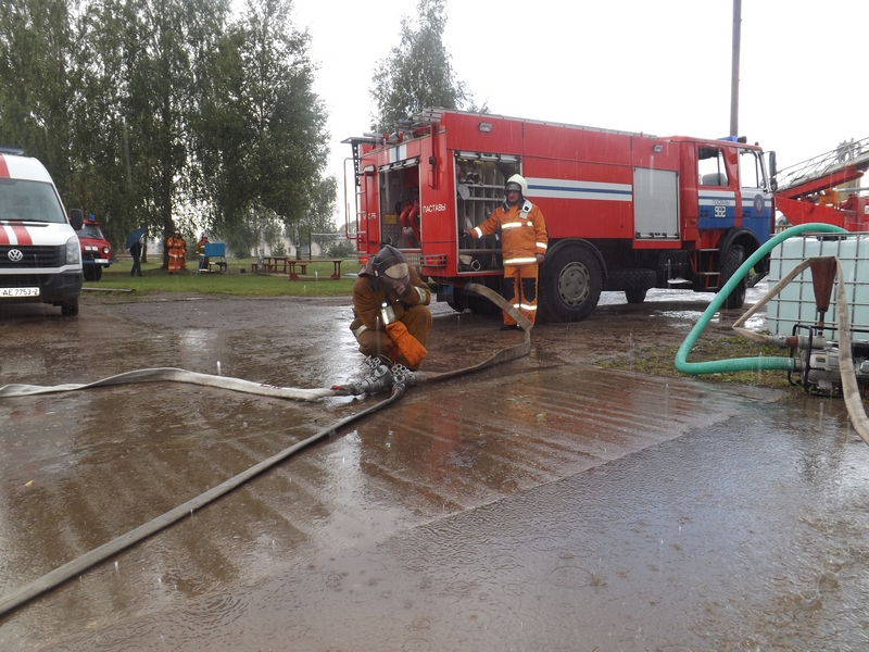 Такой вводной начались учения у Поставских спасателей. К месту вызова были направлены три автоцистерны пожарной аварийно-спасательной части №1 и одна автоцистерна пожарного аварийно-спасательного поста №13 г.п. Воропаево, пожарная насосная станция, автолестница и другая спасательная техника. Также были вызваны бригада скорой медицинской помощи и автомобиль ГАИ Поставского РОВД.