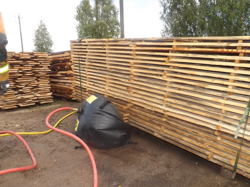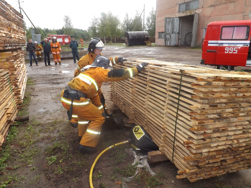 Практически одновременно с ликвидацией пожара на ЦОУ Поставского РОЧС поступила новая вводная – под штабелем древесины обнаружен заваленный человек. Казалось бы, что без специальной, грузоподъёмной техники решить положительно вопрос спасения было не возможно. Однако спасатели воспользовались надувными подушками. Доски, завалившие человека были подняты и уже через три минуты пострадавший был спасен.