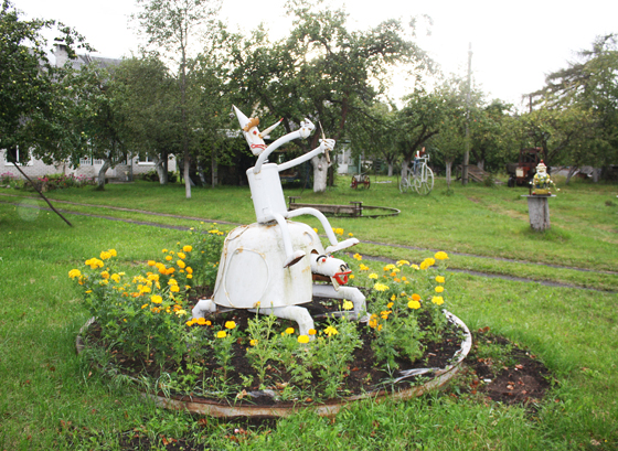 Як аказалася, тут сапраўды ёсць чаму падзівіцца. Уражвае адна толькі плошча прыдамавой тэрыторыі — яна прыблізна з паўгектара. Ад убачанага разбягаюцца вочы: арыгінальныя металічныя чалавечкі, альтанка, якая патанае ў зеляніне, вінаграднікі, што ўжо радуюць сакавітым ураджаем, сажалка… Як аказалася, усё гэта — справа рук Аляксандра Мажуты. Натхненне і, галоўнае, час для стварэння навакольнай прыгажосці ў гаспадара з’явіліся пасля выхаду на пенсію — доўгі час ён працаваў у раённым аддзеле ўнутраных спраў і права на заслужаны адпачынак атрымаў у 45 гадоў.