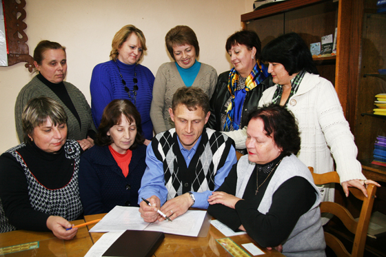 Дырэктар Аляксандр Іванавіч Кузняцоў і яго намеснік па асноўнай дзейнасці Алена Пятроўна Русецкая (крайняя справа) з настаўнікамі Галінай Васільеўнай Балмаценка, Інэсай Аркадзьеўнай Шаўловай, Валянцінай Міхайлаўнай Станюш, Раісай Дзмітрыеўнай Сарока, Наталляй Іосіфаўнай Голубевай, Аленай Якаўлеўнай Білюк і загадчыцай гаспадаркі Анжэлай Анатольеўнай Мацюшонак. Фота Пятра КУРЫЛОВІЧА.