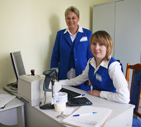 Спецыяліст па продажы паслуг Э. А. Балошка і аператар сувязі С. Б. Татарчук.