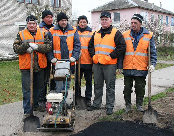 Старшы майстар Андрэй Гайковіч (другі справа) і дарожныя рабочыя Дзмітрый Лоўкіс, Аляксандр Харашэвіч, Аляксандр Кейзік, Валянцін Рачыцкі, Іван Лоўкіс.
