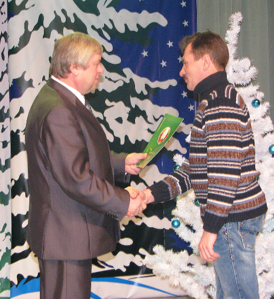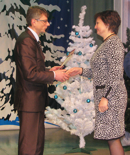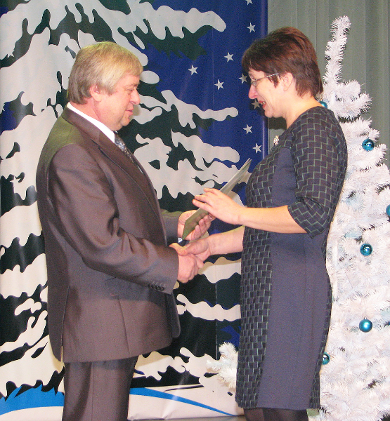 П. Л. Курто ўручае Ганаровую грамату ўпраўлення па працы, занятасці і сацабароне райвыканкама вадзіцелю Дунілавіцкага дома-інтэрната П. І. Літоўцу.