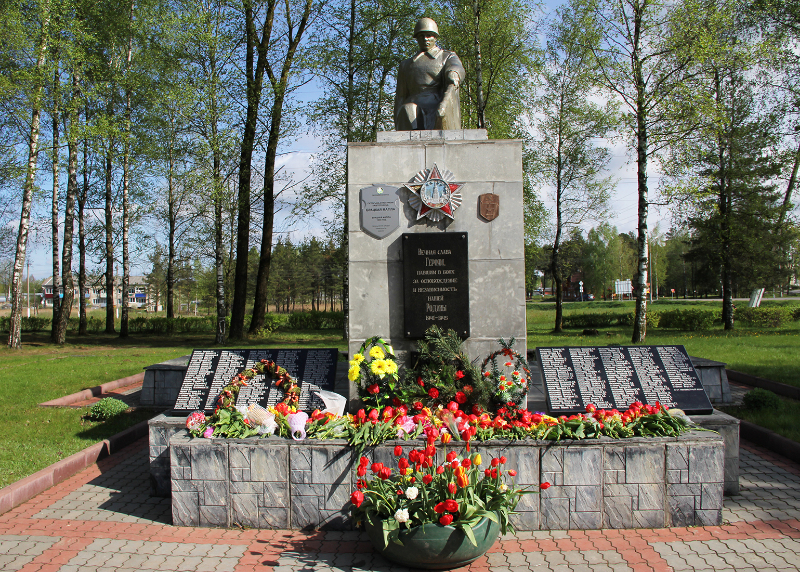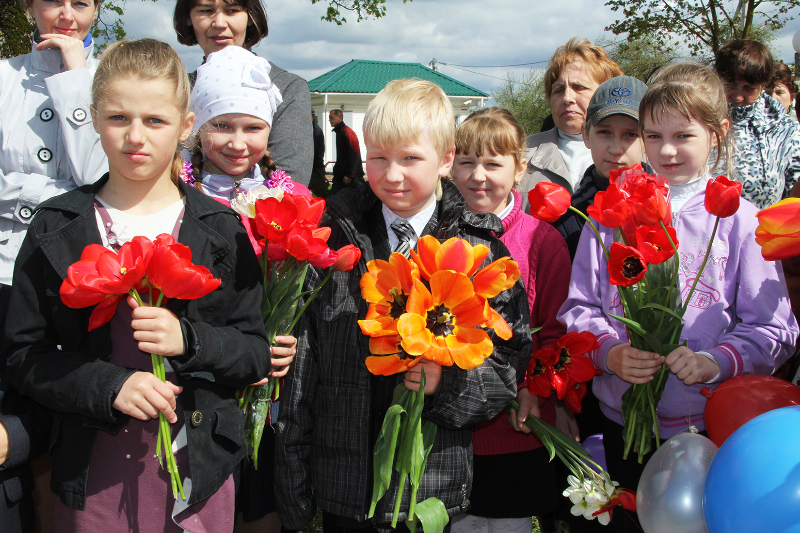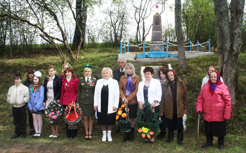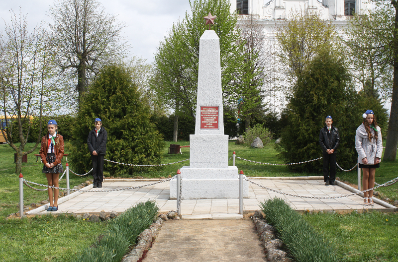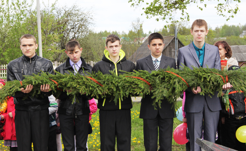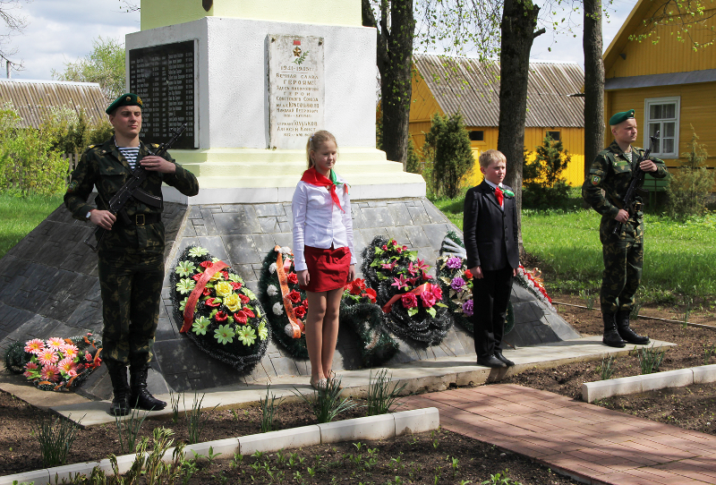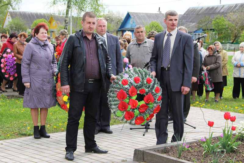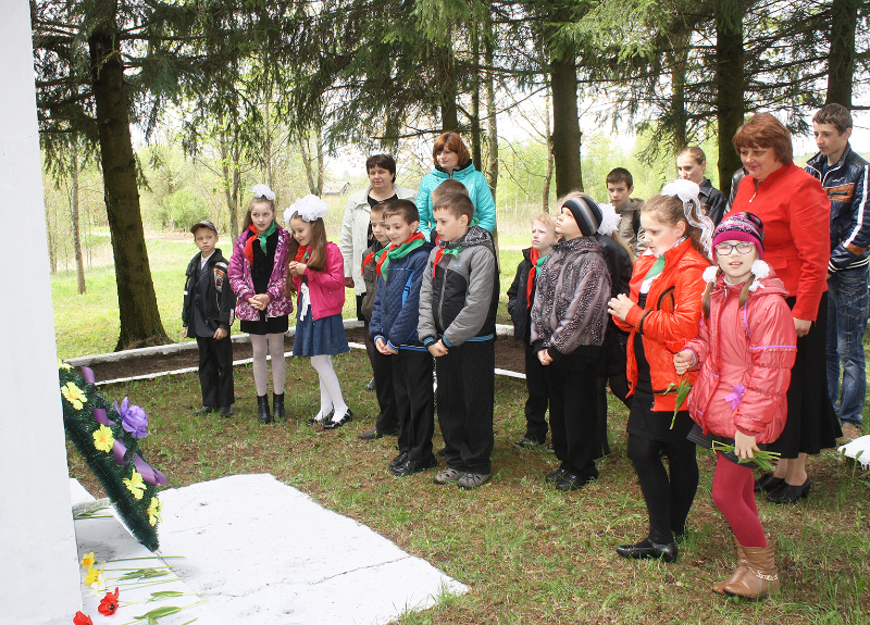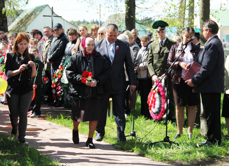 …Гучаць шчымлівыя песні ваенных гадоў. Вялікай групай да брацкай магілы воінаў і партызан у цэнтры аграгарадка ідуць дзеці з кветкамі. Хутка яны лягуць да помніка тым, хто не дачакаўся сонечнага блакітнага неба над Радзімай — такога, якім яно было падчас урачыстасці.
