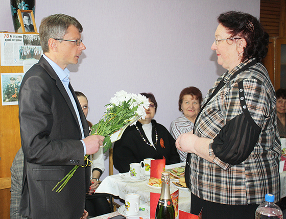 Намеснік старшыні райвыканкама Ю. М. Кісялёў віншуе з юбілеем Людмілу Аляксандраўну Балотнікаву.