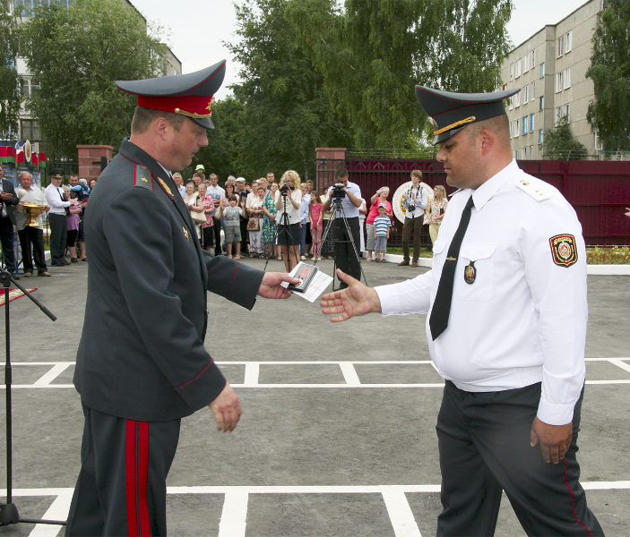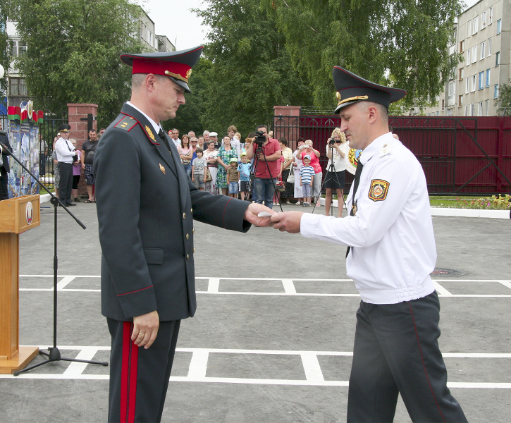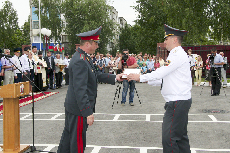 Ад імя кіраўніцтва і апарата Міністэрства ўнутраных спраў Рэспублікі Беларусь А. І. Шуневіч павіншаваў асабовы склад аддзялення і ўсіх прысутных з наваселлем, пажадаў здароўя, дабрабыту, поспехаў і ўдачы ва ўсіх справах і пад гукі аркестра і апладысменты прысутных уручыў нагрудныя знакі міністэрства “Выдатнік міліцыі” прапаршчыкам — міліцыянеру-вадзіцелю А. У. Бакуновічу і міліцыянеру У. Э. Трашчынскаму.