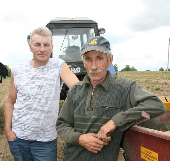 Механізатары Аляксандр Муляронак і Віктар Лешчык. Першы працаваў на адвозцы бульбы, другі разорваў барозны.