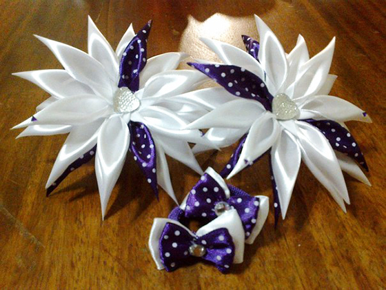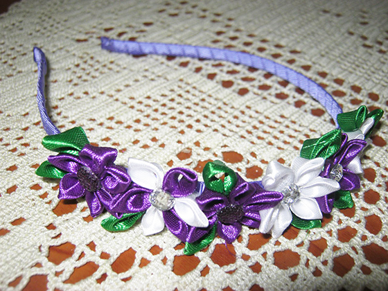 Гэта дзіўная тэхніка родам з Японіі і называецца канзашы. Аснова работ — кветкі, якія рукадзельніцы вырабляюць са стужак або кавалкаў тканіны, складваючы палоскі ў бутоны і пялёсткі. Гэтыя элементы мацуюцца рознымі спосабамі на жаночыя аксесуары для валасоў. Пра гэта я даведалася з сацыяльных сетак, дзе Святлана актыўна дзеліцца фотаздымкамі сваіх крэатыўных работ. Сярод іх — дзіцячыя заколкі, шпількі, павязкі, абручы… У творчым “арсенале” ёсць і не менш арыгінальныя тапіярыі (дэкаратыўныя вырабы з самых розных матэрыялаў, якія па форме нагадваюць дрэўцы).