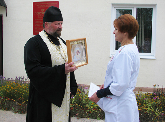 Настаяцель храма Свяціцеля Мікалая Цудатворца г. Паставы айцец Валерый перадае абраз Маці Божай пазаштатнай загадчыцы псіханаркалагічнага аддзялення Ж. П. Паповай.