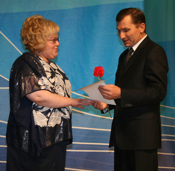 Начальнік аддзела Міністэрства адукацыі Рэспублікі Беларусь М. С. Булько ўручае Ганаровую грамату выкладчыцы А. І. Кухальскай.