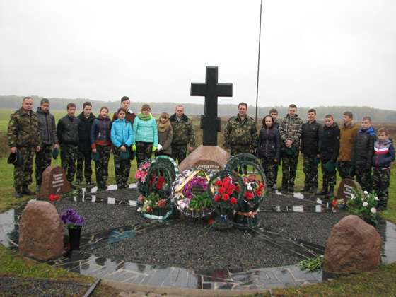 Затым школьнікі наведалі памятны знак, устаноўлены сіламі ваеннаслужачых недалёка ад месца падзення 4 гады назад, 20 кастрычніка 2011-га, баявога верталёта пагранвойскаў з двума членамі экіпажа і журналістамі тэлерадыёвяшчальнай арганізацыі Саюзнай дзяржавы на борце. У той страшнай аварыі загінулі ўсе, хто знаходзіўся ў вінтакрылай машыне.