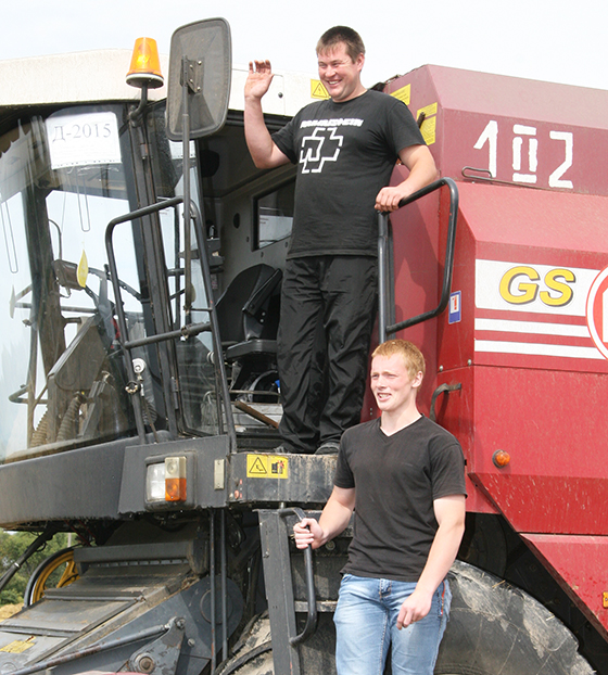 Камбайнер Валерый Ярашэвіч і яго памочнік Антон Міхалевіч.