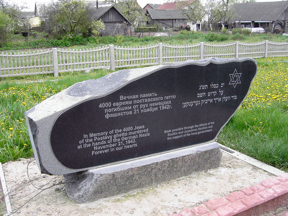 У час акупацыі па ўсёй Беларусі фашысты пачалі ствараць гета — спецыяльныя месцы ў населеных пунктах, куды перасялялі яўрэяў. У Паставах гета з’явілася ў лютым 1942 года на вуліцах Браслаўскай (цяпер Ленінская), часткова Горкага і Чыгуначнай. Усе дамы, у якія былі пераселены яўрэі, немцы абнеслі высокім плотам. Паміж слупамі быў нацягнуты калючы дрот. На вопратцы яўрэі абавязаны былі насіць шасціканцовыя зоркі жоўтага колеру. Ім не дазвалялася хадзіць па тратуары. У гета людзі жылі цесна, па некалькі сем’яў у доме, галадалі. І ўсё ж спадзяваліся, што будуць жыць. Ніхто не мог паверыць, што ні ў чым не вінаватыя людзі будуць знішчаны. Тым не менш 21 лістапада 1942 года адбылося самае страшнае: людзі з пастаўскага гета былі расстраляны. Цяпер гэта вялізная брацкая магіла знаходзіцца на тэрыторыі ДРБУ-132 па вуліцы Ленінскай. На невялічкім помніку, пастаўленым пасля вайны Гендэлем Шнэерам Рахмелевічам, якому ўдалося ўратавацца, надпіс: “Здесь лежат евреи Постав и Дуниловичей, убитые немецкими фашистами 21 ноября 1942 года. Мы вас никогда не забудем”.