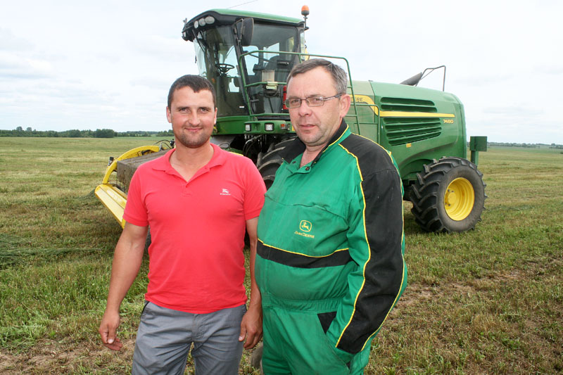 Павел Лінга і Іван Кармаза ля кормаўборачнага камбайна “Джон Дзір-7480”.